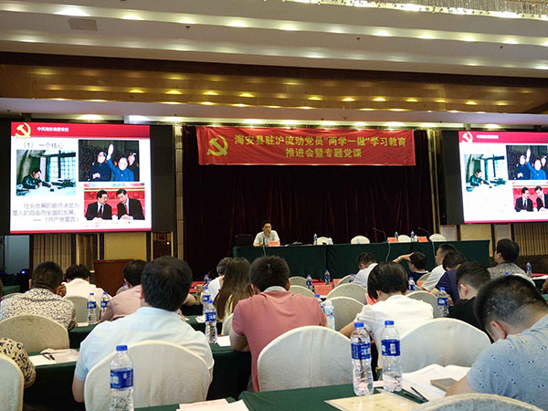 同時(shí),根據(jù)縣委組織部對(duì)“兩學(xué)一做”教育活動(dòng)的工作安排,“聯(lián)合黨委”于5月19日下午舉行“兩學(xué)一做”教育活動(dòng)專題黨課?!奥?lián)合黨委”書(shū)記李忠澤作“兩學(xué)一做”動(dòng)員報(bào)告,海安縣委黨校常務(wù)副校長(zhǎng)徐進(jìn)、副校長(zhǎng)程衛(wèi)國(guó)分別作“學(xué)習(xí)黨章、學(xué)習(xí)系列講話”專題黨課,海安籍在滬流動(dòng)黨員近400人參加活動(dòng)。