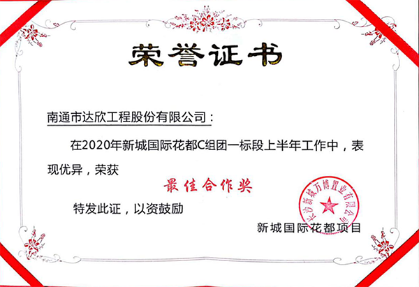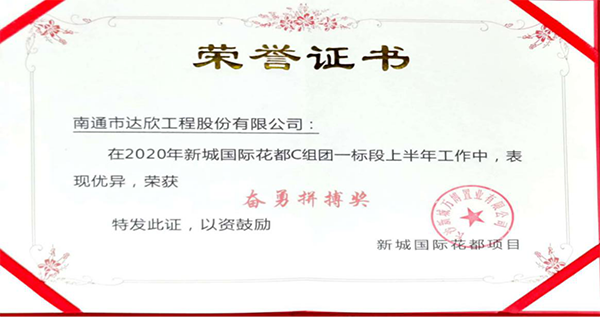 近日,新城國(guó)際花都C組團(tuán)一、二標(biāo)段項(xiàng)目,在公司各級(jí)領(lǐng)導(dǎo)的關(guān)心支持下,在項(xiàng)目全體施工人員的共同努力下,提前實(shí)現(xiàn)交付。為此,獲得長(zhǎng)沙新城萬(wàn)博置業(yè)有限公司工程授予的《奮勇拼搏》、《最佳合作》兩個(gè)獎(jiǎng)項(xiàng),博得了新城萬(wàn)博置業(yè)有限公司對(duì)我司工作的高度認(rèn)可。