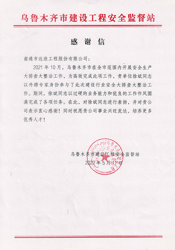 6月8日,集團(tuán)收到一封來自烏魯木齊市建設(shè)工程安全監(jiān)督站的感謝信,詳細(xì)內(nèi)容如下:
