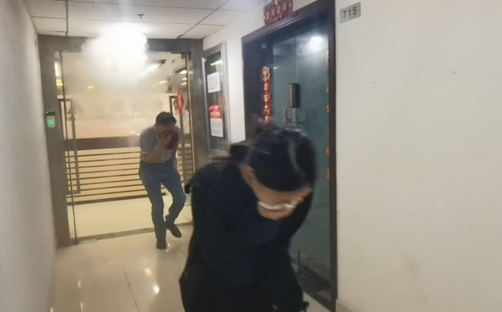 現(xiàn)場從發(fā)現(xiàn)著火點、報警、疏散人員等情景開展模擬演練。隨著火警警報的響起,在場人員立即按照預(yù)先制定的疏散方案行動。大家迅速采取“彎腰低頭、捂鼻貼墻”的逃生姿勢,在疏散過程中,大家保持冷靜,有序地沿著疏散通道向室外撤離。