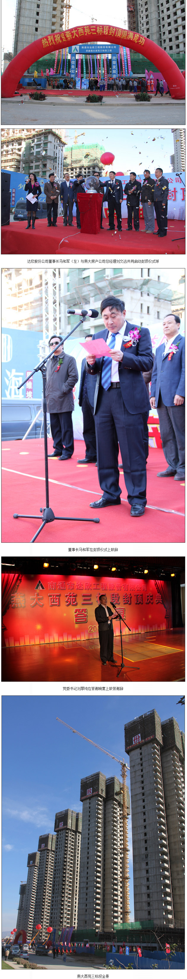 2009年11月10日,我公司承建的河北省秦皇島市燕大西苑三標(biāo)段工程(5棟框剪結(jié)構(gòu)住宅樓及地下車庫(kù)、商業(yè),地上34層,地下2層,總建筑面積96151㎡)在燕大房地產(chǎn)開(kāi)發(fā)有限公司負(fù)責(zé)人刑廣忠的一聲號(hào)令下啟動(dòng)了開(kāi)工儀式,2010年11月8日,由我公司董事長(zhǎng)馬和軍與燕大房地產(chǎn)開(kāi)發(fā)有限公司總經(jīng)理劉文遠(yuǎn)共同啟動(dòng)封頂儀式球,宣布燕大西苑三標(biāo)段提前圓滿封頂。
